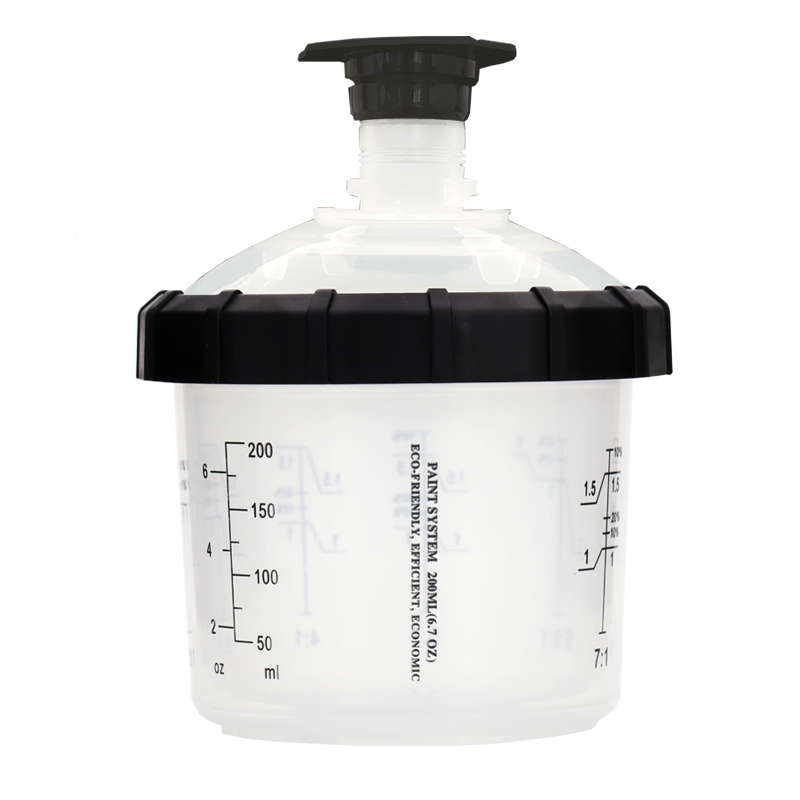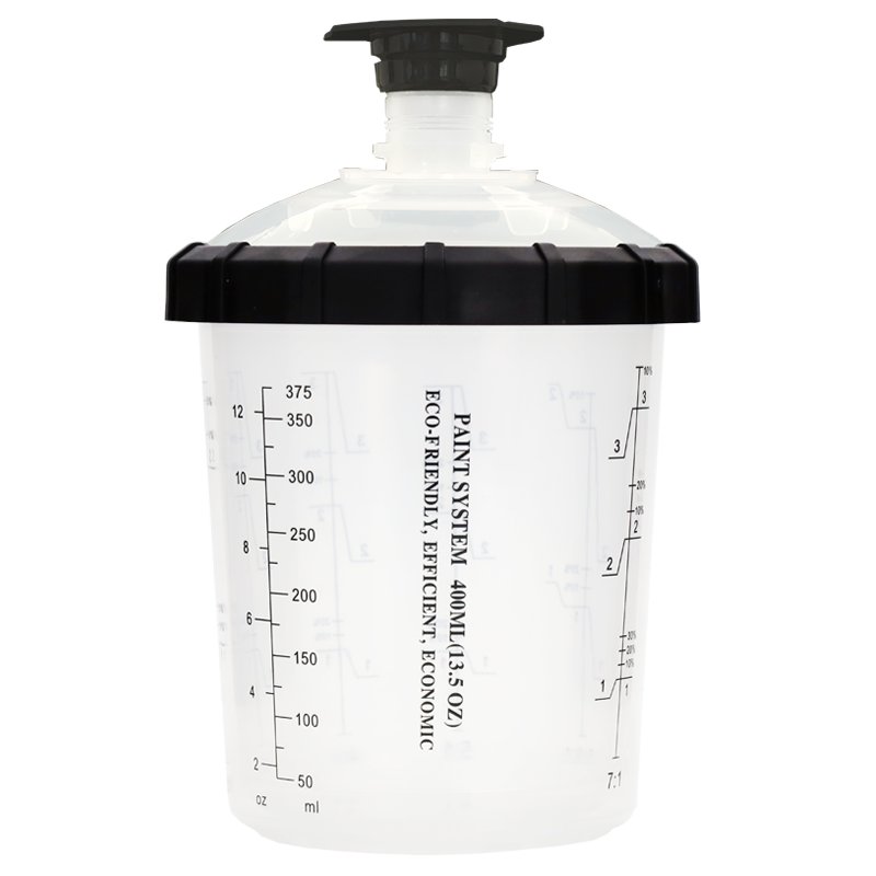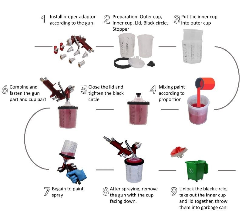 Mixing and painting 2-in-1: This disposable spray cup system can improve spray efficiency and save you time, labor and money. No need to mix pigments in an extra paint mixing cup!